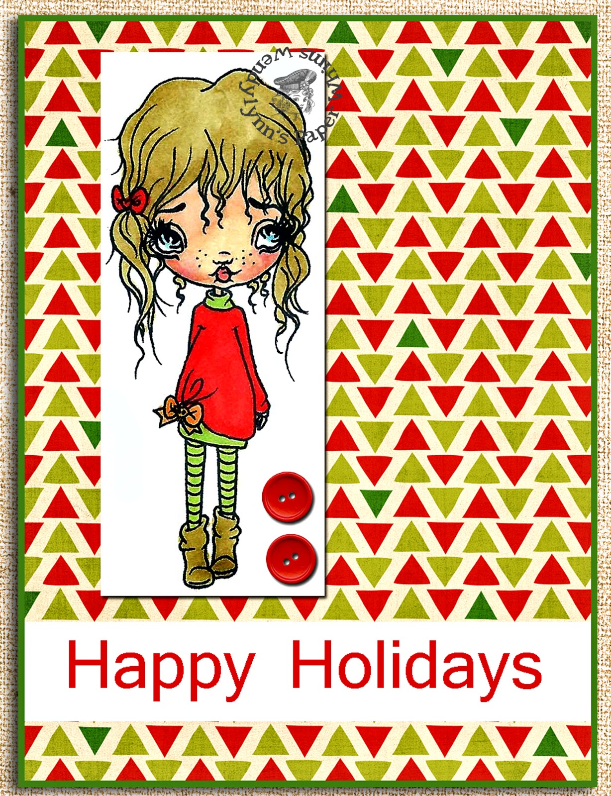 I used a digital stamp from Oddball Art Stamps called Alex #172 for this card. The image was colored with pencils and markers. The card base is a freebie from Pixel Scrapper. The card is embellished with two red buttons.